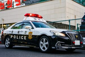 1台のパトカーがパトライトをクルクル回転ながら店前に停車。一人男性の制服警察官が開店前の店内に駆け付けたので待っていた先客が少しざわつく事態となりました。