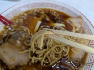 麺は前述でお伝えした中細ちぢれタイプの生麺を使用しており。すすって噛むごとに加水率がやや低めなのかぱつっとした食感で小麦の風味もしっかり感じるものとなっております。