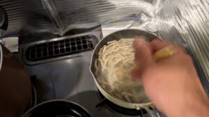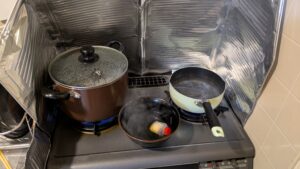コンロに鍋を2つ用意して麺茹で用とスープ温め用に分けて温めていきます。鶏油は丼にお湯を入れてその中で温めていきます。