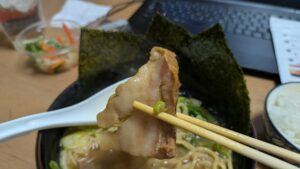 チャーシューは豚バラのものが2切入って、厚みもそれなりにあります。1切口の中に頬張ると脂身はやや多めにありますが脂っぽさやしつこさは全くなく、脂の甘みがありつつもスモークしているので鼻から抜ける爽快感もあります。