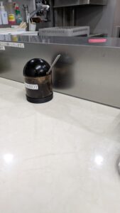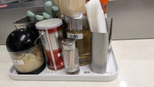 店内は全てカウンター席15席が完備され、卓上調味料はカスターに胡椒、刻みニンニク、お酢、一味唐辛子、レンゲ、紙ナプキンが完備。