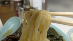 すでにちゃん系店お馴染みである「達磨製麺」の平打ちストレート麺は、安定したつるもち食感で相変わらず舌触りも滑らかに入っていきます。