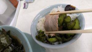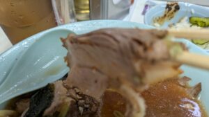 チャーシューは厚みと大きさがやや不揃いのものが丼一面に敷き詰められており、この絶妙な薄味な味付けとスープに染みた味が重なって、これが非常にご飯のおかずとして最高のメインディッシュになります。