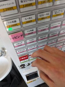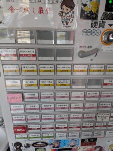お店の券売機のメニューはこのようなラインナップ上段にラーメンのメニューと下段につけ麺のメニューが配置され、何といってもトッピングの種類が豊富にあるのがちょっと驚きです。トッピングの種類は他の武蔵家系譜の中でもトップクラスの多さです。