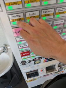 「ライス小100円」をプッシュ。食券をホールの丸刈り頭の男性従業員に渡し、お好みを聞かれると「全部普通」にしてカウンター席に着席しました。