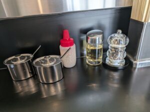 卓上調味料はブラックペッパー、お酢、あたりごま、おろしニンニク、豆板醤といった家系ラーメン店の標準的なラインナップ、おろし生姜は店員さんに頼めば持ってきてくれるのことです。