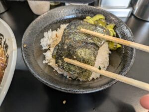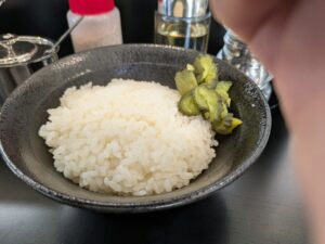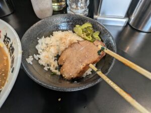おろし生姜は、お店でおろしているものを提供しており、生姜の香りが丼から離れていてもたちこめて、スープに溶かして食べると前半の強烈な味からさっぱりした味に変わっていきます。