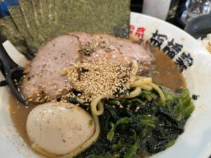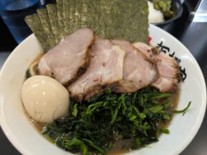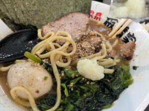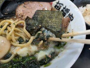 麺は家系ラーメン店の中ではトップクラスの極太で訪問する前は酒井製麺を使用しているのかなと思っていましたが、逆にあの二朗系の麺を彷彿させる極太とごわっとした麺のほうがあっていて、仮に酒井製麺の麺だったらあの濃度と粘度があるスープに負けてしまうんじゃないかと思います。