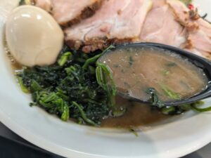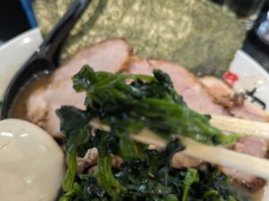 ほうれん草は、某資本系家系ラーメン店のほうれん草増しの量とは比べ物にならない量で盛られて、終始しつこいほど絡んできましたが、ほうれん草のくどさは全くなく、スープにつけて食べてみると、ほろ苦さと甘さが両方口の中に広がり、最後まで食べることができます。