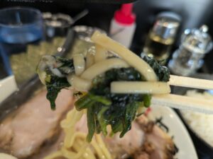 続いて麺を箸で持ち上げてみると、スープと同様ほうれん草がしつこいほど絡み絡んできて、使用している麺はおそらく地元宇都宮の製麺所で仕入れている麺ですが、麺の形状が四角のストレートタイプで、麺の太さは私が今まで家系ラーメン店を延べ200軒以上食べてきましたが、一番太いんじゃないかと思います。