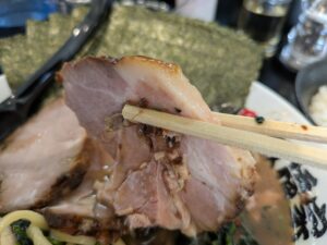 次にメイントッピングのチャーシューは、豚肩ロースの煮豚を使用していますが、こちらもとにかくデカくて、しかも厚さがあります。