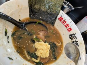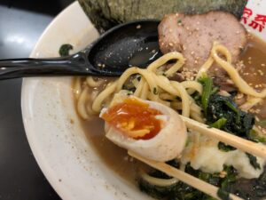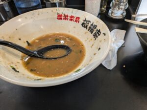 ボリュームだけでなくお店で炊かれた豚骨メインのスープは武蔵家の流れを汲む言葉では言い表せない独特の香りと濃度、ベタッとした粘度がありながらも醤油ダレのエッジもちゃんとあって最後まで飽きずに食べることができましたね。