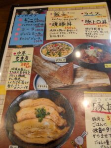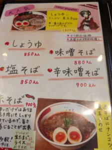 ラーメンのメニューはしょうゆ、塩そば、味噌そば、辛味噌そば、担々麺風の赤そばの5種類のラインナップ。その他限定メニューといった構成です。