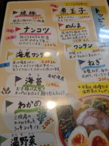 こちらはトッピングメニュー。中でもお店のお勧めは「ナンコツ」。写真で見たところ結構ふてぶてしいボリュームで食べ応えがありそうです。