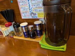 卓上調味料は店内はほぼ満席でしたのですべては写せませんでしたが、醤油、ラー油、お酢、ホワイトペッパー、ブラックペッパーにふりかけといったラインナップ。