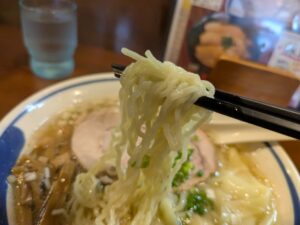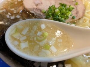 まずはスープから。口当たりは非常にあっさりとさっぱりとして、動物系と魚介系の出汁がバランスよく入っていき刻みねぎの甘みのあるシャキシャキ食感がいいアクセントとなってぐいぐい飲んでしまいます。