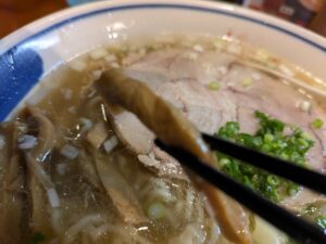 大判の豚バラチャーシューは箸で掴むと崩れるほど柔らかく、脂っぽさも抑えられながらもホロホロと柔らかく、味も染みていてこちらも非常に旨いです。