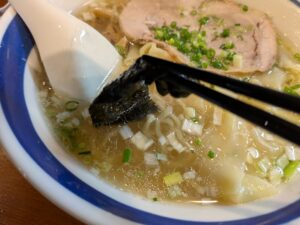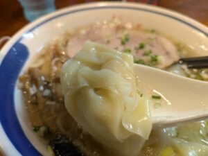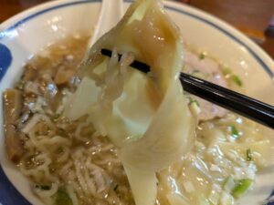 ワンタンの餡の量は普通ですが、うっすら小海老が1個入っている贅沢さでしかも塩ベースのスープの相性は非常にいいです。