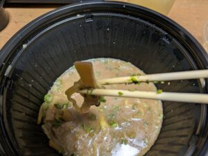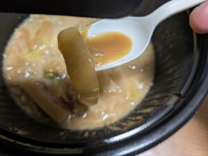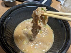 このとんこつスープ「コンビニで売ってあるカップラーメンの豚骨スープと変わらなくないか?」と思うほど吉野家独自性の味をあまり感じません。確かに美味しいことは美味しいですが….。