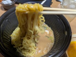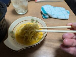 麺も生卵にくぐらせてつけ麺スタイルで食べてみます。麺もまろやかな風味になって生卵につけて食べるとより食べやすい食感になっています。