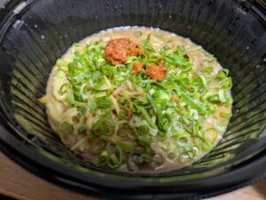 自宅の冷蔵庫に入っていたカット青ネギと「ニンニクマシマシたれ」を投入してみます。ニンニクマシマシたれは辛さだけでなく塩味もあるので投入すると濃厚かつまろやかな豚骨スープが一変して凶暴性を出してくるほどパンチが効いた味になります。