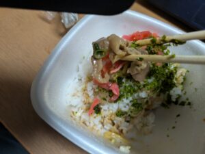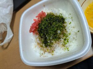 〆にセットでついてきたライスに吉野家店内の入り口に置いてあった紅しょうがの袋を開け、さらに自宅で保管されている青のりを投入します。