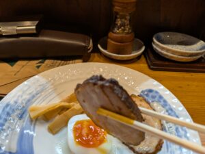 トッピングは味玉、ワンタン、チャーシューが低温調理が1枚、先ほどのおつまみセットに提供された煮豚チャーシューが2枚、メンマと海苔1枚と豪華なラインナップです。