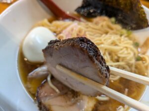 チャーシューは肉厚でありながら脂身も少なく、肉質の固さもちょうどいいですね。しかもバーナーでしっかり炙っているので香ばしさもかんじます。
