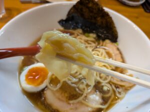 続いて自家製麺の中細ストレート麺をすすってみると、麺は加水率が低く噛むとぱつっと切れるタイプですが後半になると、もちッとした食感に変化していき、店名にあやかってか小麦の風味と甘みも感じます。