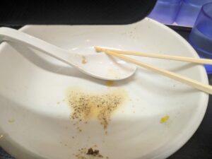 味変でブラックペッパーとホワイトペッパー両方を入れてみます。前回同様ホワイトペッパーを入れるほうが煮干し出汁のスープがより引き締まってきます。