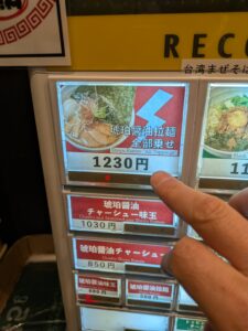 今回は初訪問ということで券売機左上のボタンの「琥珀醬油拉麺全部のせ1230円」と真っ赤卵を使用した「卵かけご飯250円」のボタンをプッシュ。