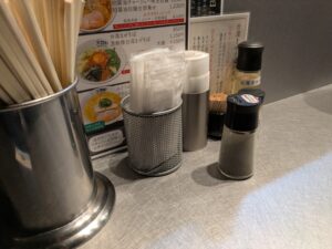 卓上調味料は、ブラックペッパー、まぜそば用の花椒、お酢といったシンプルな構成。訪問時は平日月曜の夜19時半ごろ。客層は上智大学を中心とした学生街、オフィス街ということなので、私も含め店内はカウンター席18席ほどで満席ではありませんでしたが、サラリーマン、OLの一人客が中心でした。