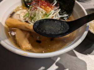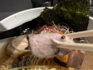 醤油ダレの風味や塩味は控えめで、動物系の出汁よりも煮干し、昆布、鰹からとった出汁がじんわり出てきて、後から醤油の風味が優しく来る感じです。真矢さんの生前のビジュアルの印象とは違うしみじみと味わえるスープです。