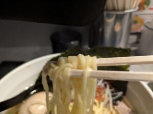 麺はちょっと画質が悪いですが、中細平打ちちぢれ麺で食べるとピロピロとモチモチした食感で、昔山形県米沢市で食べた米沢ラーメンの食感と非常に近いです。
