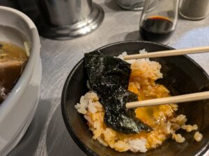 スープの味が染みた海苔を卵かけごはんに巻いて食べると、家系ラーメンと違ってスープにほどよい出汁が効いているので、ちょっとした高級旅館の朝ごはんを食べている気がします。海苔の大きさは家系ラーメン店のものより若干小ぶりでありますが、厚みがあってしっかりしていて海苔の磯風味もいいです。
