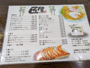 メニュー表はこんな感じ。注文制でラーメンの味は「醤油」と「塩」の二種類の構成で、お店自慢の餃子、もつ煮など提供されていますがご飯ものは用意されていないみたいです。
