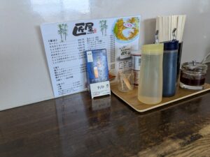 卓上調味料はコショー、醤油、お酢、ラー油といったシンプルなラインナップ。
