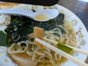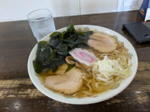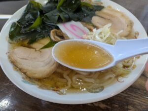 注文してから待つこと5分ほど「醤油わかめラーメン」が着丼しました。見るからにビジュアルはノスタルジックで「昔ながらの中華そば」といった感じで、チャーシューはデフォで2枚入っています。