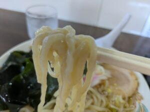 続いてお店の厨房の横に設置されている製麺室から作っている自家製青竹手打麺を箸で持ち上げてすすってみると、早朝に訪問した【日太】さんのピロピロしたものより麺に厚みがありモチモチして弾力があり、小麦の風味もあり食べ進めても麺がのびることがないです。