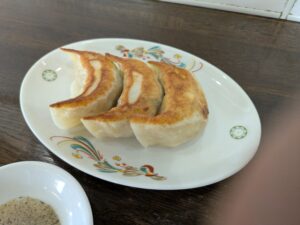 食べ進んでいる途中にお店自慢の焼きたての餃子が到着。こちらもふてぶてしくてデカいです。餃子のたれはお酢とコショーにしました。