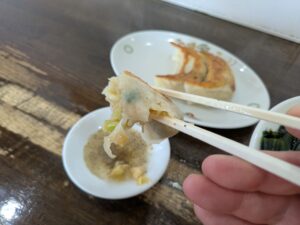 餃子を一口食べてみると、餃子の餡はニンニクは不使用でキャベツ中心の野菜が多めに入っており非常にあっさりした味付けで食べやすいです。