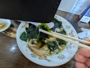 また「わかめラーメン」を注文したんですが、丼の底の方からすくいだすと半端ない量のわかめがあふれ出てくるように出てきて、ラーメン自体酸性な食べ物ですけどワカメはアルカリ性食品なので体の中が中和された感じがしますね。